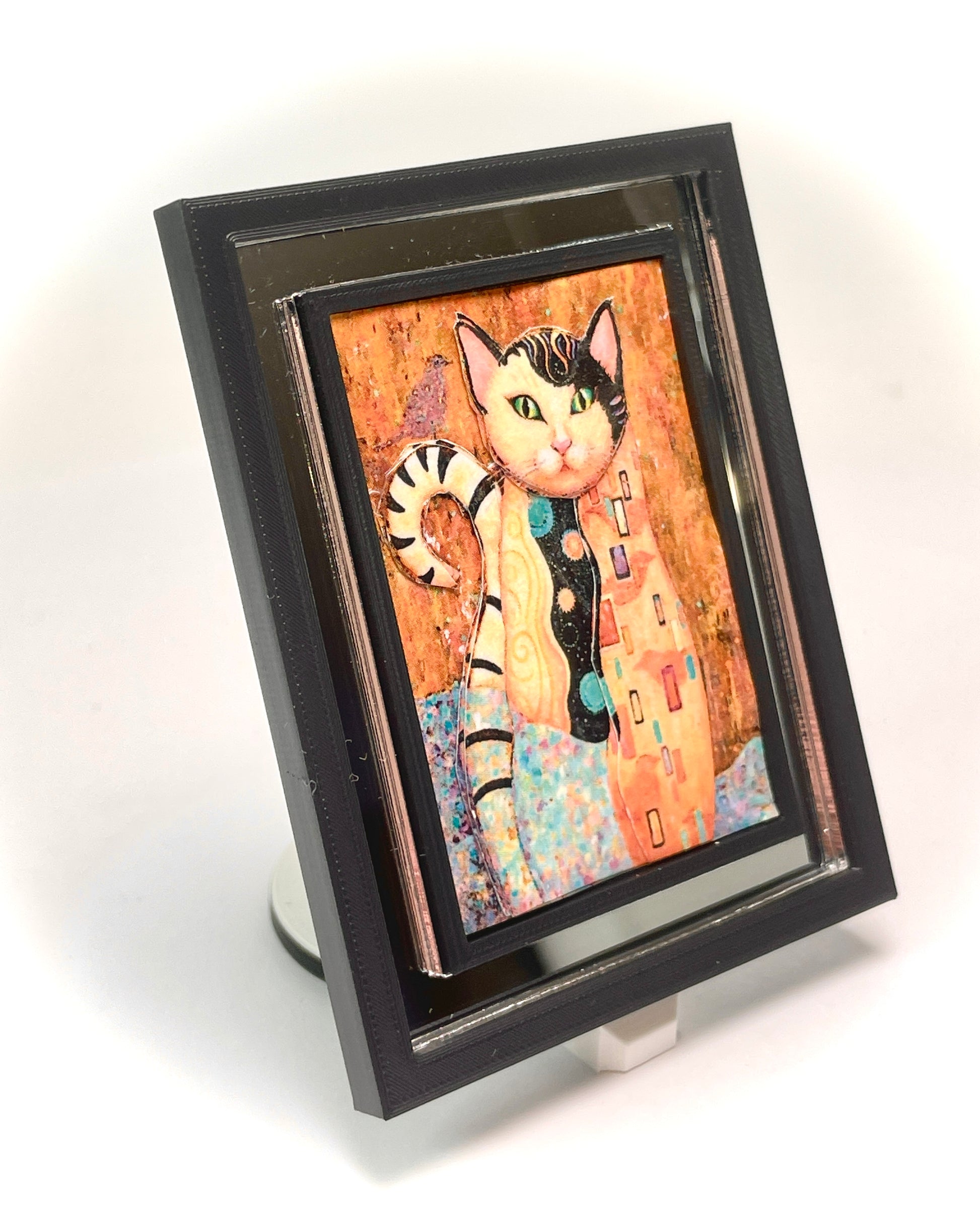 Artfully hand-crafted 3D layered paper cat picture in a mirrored frame.