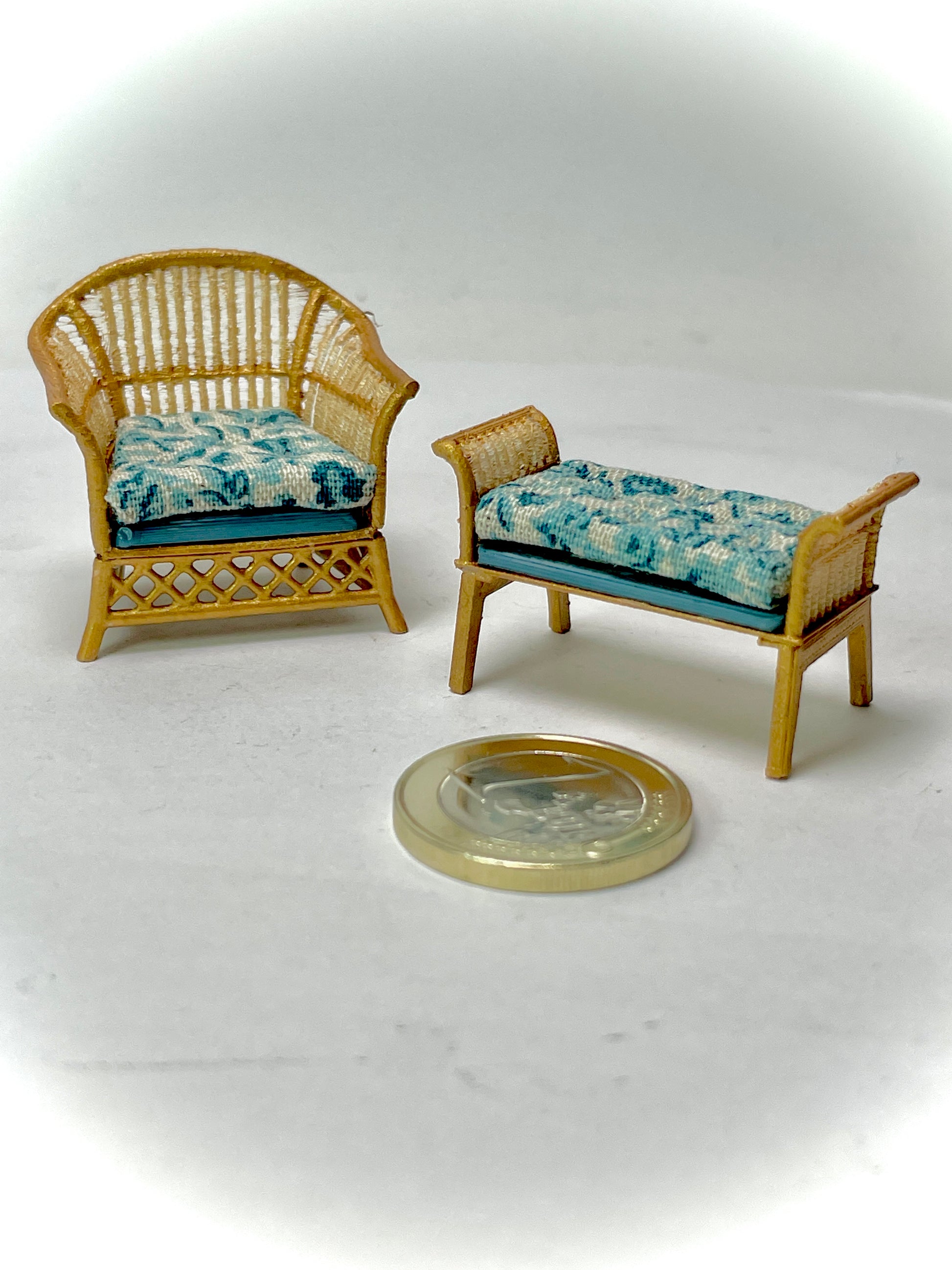 1:24 Dollhouse cane rattan petit floral blue furniture - Half Scale